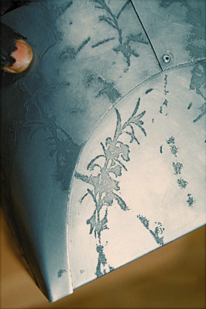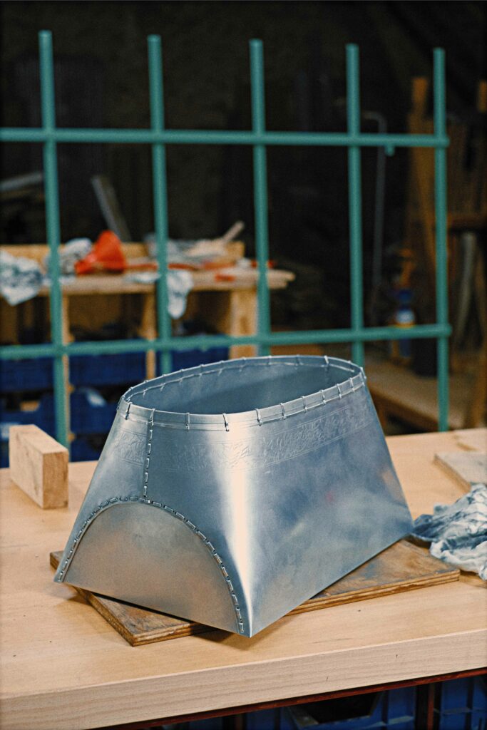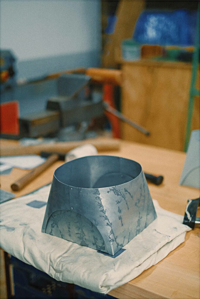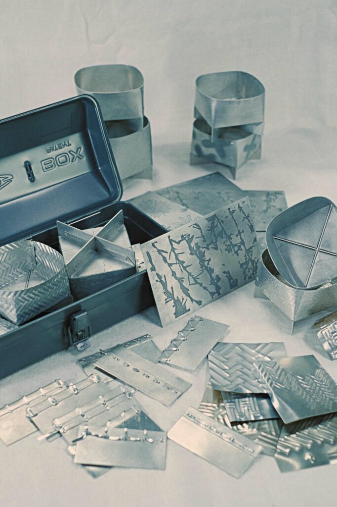 techniques used : folding, stamping, electro etching, punching, riveting, sewing, hammering, polishing.